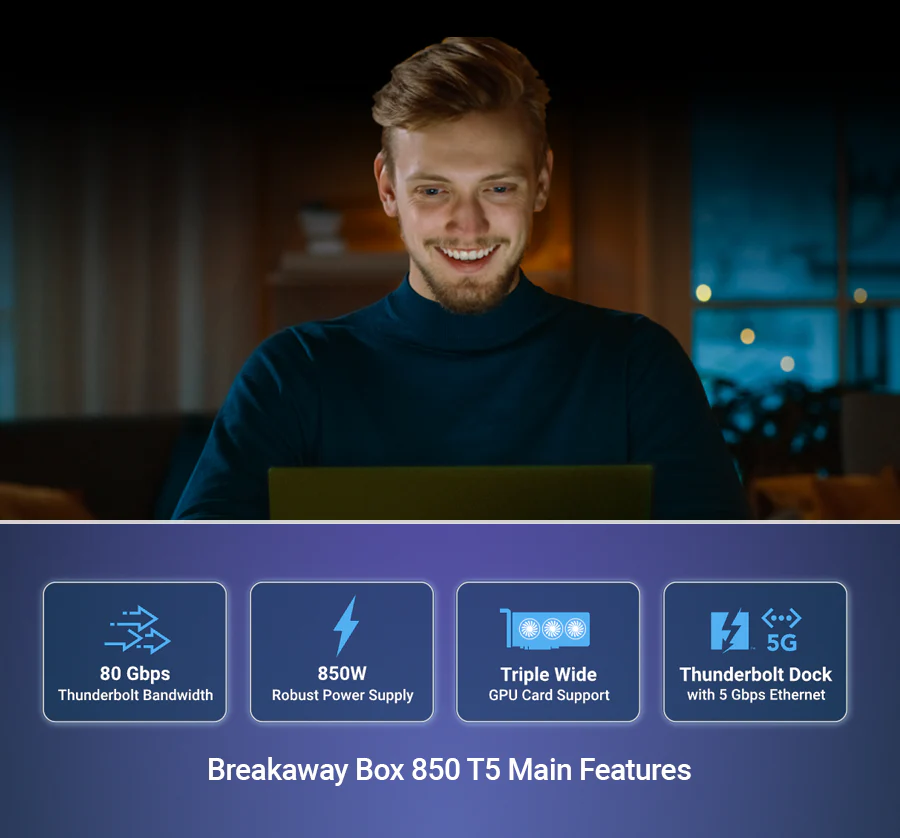 – Entfesseln Sie mit Ihrem Thunderbolt 5 Windows 11-Laptop eine GPU-Leistung, die fast der eines Desktop-PCs entspricht. Die Breakaway Box 850 T5